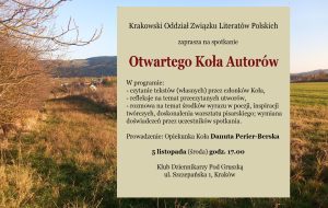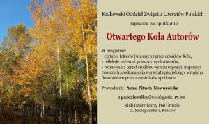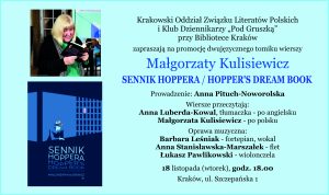 We wtorek 23 września gościliśmy w Krakowie Koleżankę z Warszawskiego Oddziału ZLP – Marlenę Zynger. Jej spotkanie autorskie w Klubie Dziennikarzy Pod Gruszką zatytułowane „Wszystko jest naszym wyborem” poprowadziła prezes Krakowskiego Oddziału ZLP – Anna Pituch-Noworolska. Podzieliła się ona swoimi refleksjami na temat promowanego tomiku wierszy „O!NIE!” i zasypała bohaterkę spotkania wnikliwymi pytaniami dotyczącymi jej twórczości literackiej, działalności na rzecz literatury, a także Kwartalnika Literacko-Kulturalnego „LiryDram”, którego Marlena Zynger jest redaktorką naczelną.