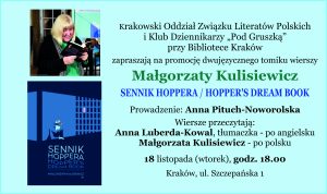 We wtorek 23 września gościliśmy w Krakowie Koleżankę z Warszawskiego Oddziału ZLP – Marlenę Zynger. Jej spotkanie autorskie w Klubie Dziennikarzy Pod Gruszką zatytułowane „Wszystko jest naszym wyborem” poprowadziła prezes Krakowskiego Oddziału ZLP – Anna Pituch-Noworolska. Podzieliła się ona swoimi refleksjami na temat promowanego tomiku wierszy „O!NIE!” i zasypała bohaterkę spotkania wnikliwymi pytaniami dotyczącymi jej twórczości literackiej, działalności na rzecz literatury, a także Kwartalnika Literacko-Kulturalnego „LiryDram”, którego Marlena Zynger jest redaktorką naczelną.